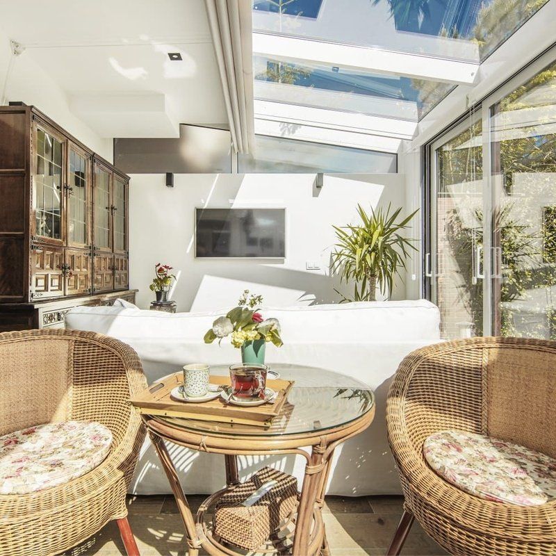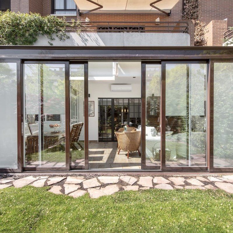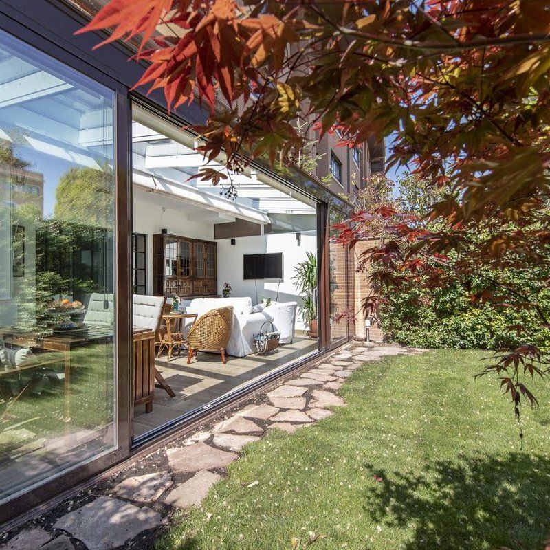 Cerramiento de aluminio y techo de cristal con puertas correderas elevables serie MATRA-135 en bicolor.