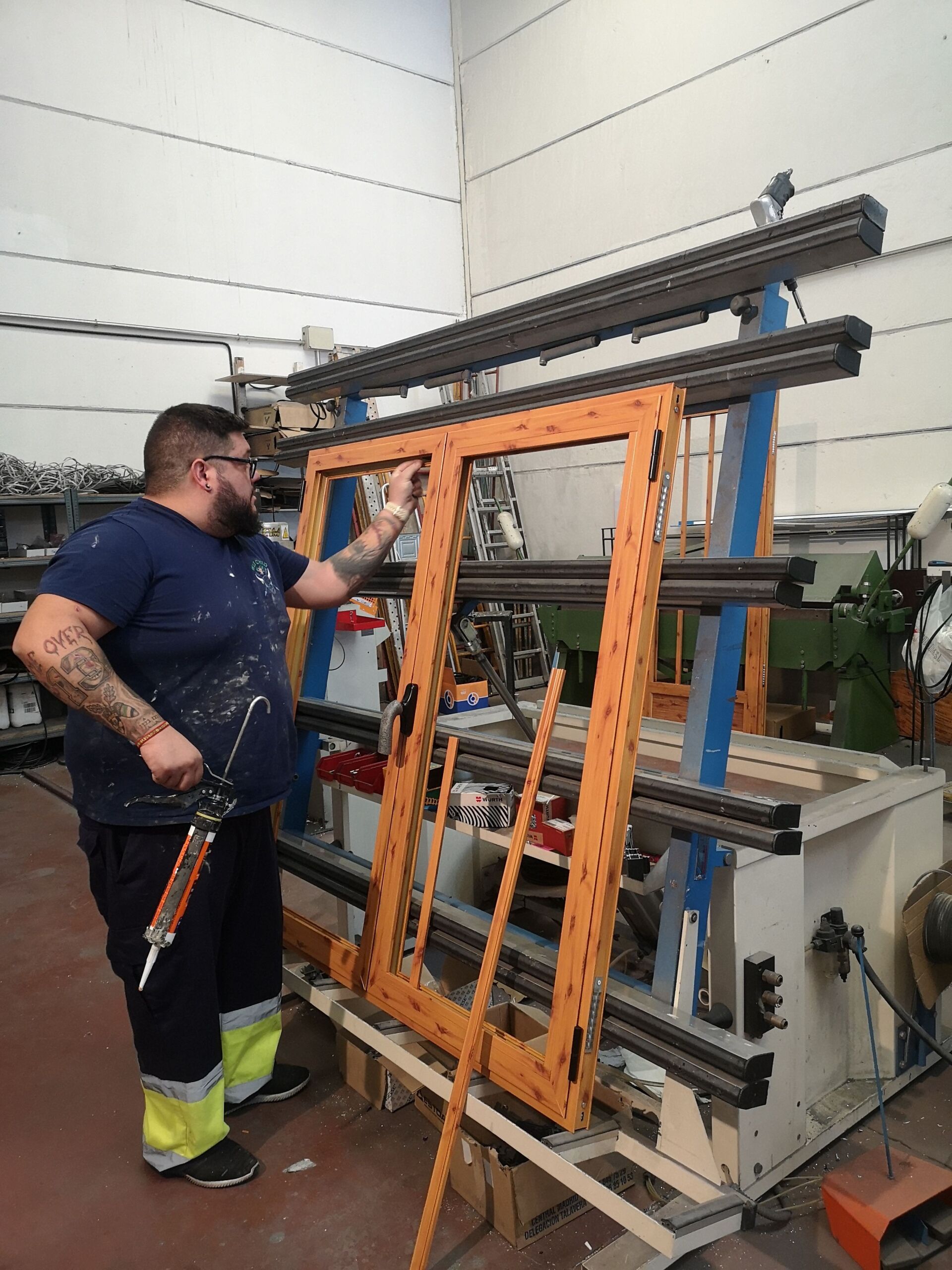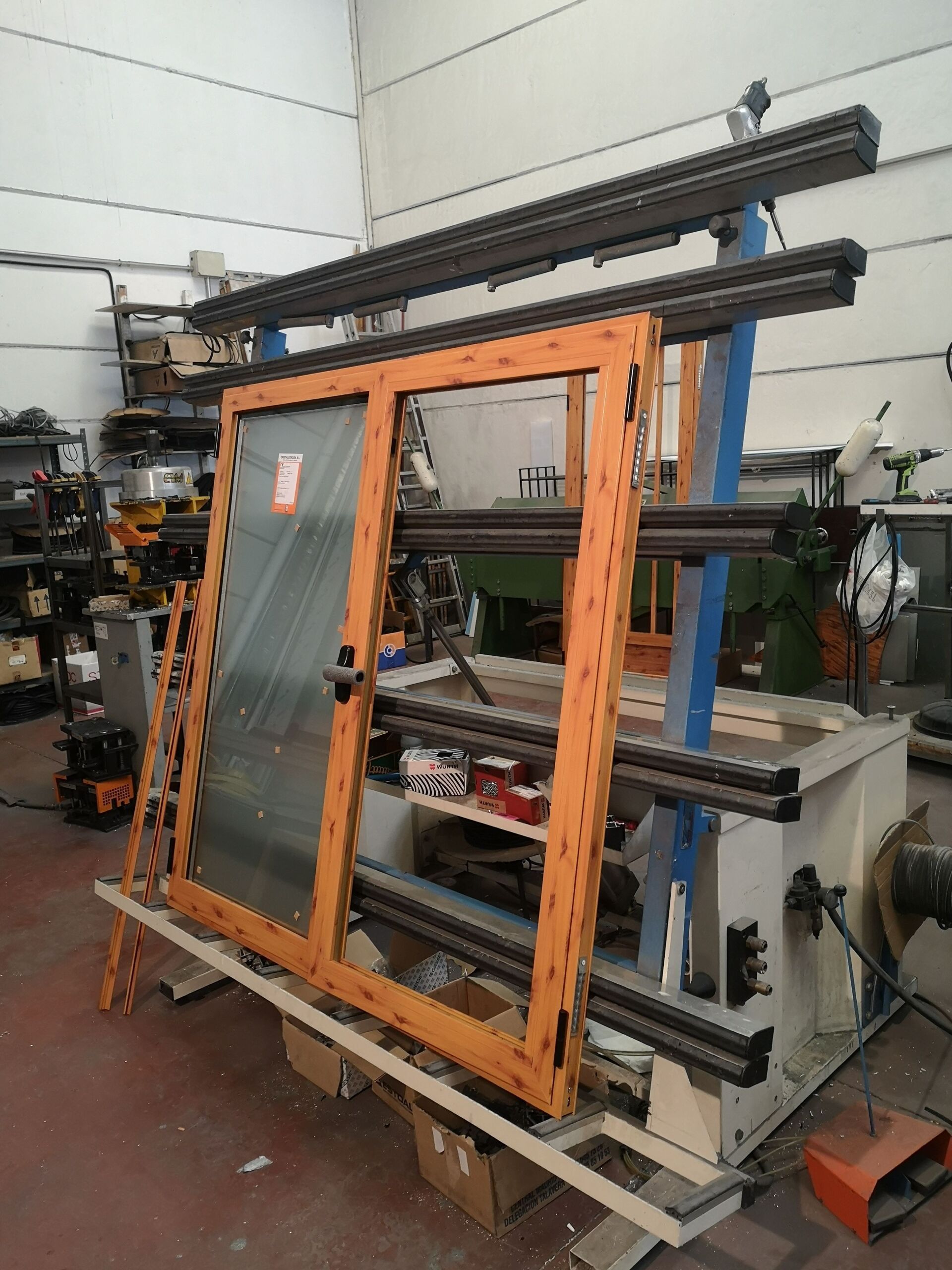 Ventana de aluminio imitación madera, acristalamiento en taller, para servir directamente en obra, disponemos de toda la maquinaria necesaria para la, correcta fabricación en nuestras instalaciónes, para que nuestros productos salgan totalmente terminados al 100% con una precisión exacta.